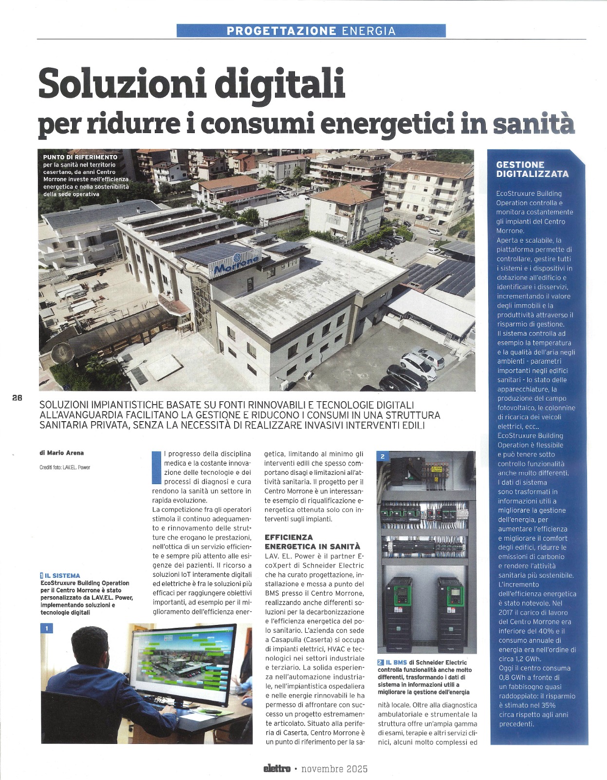 LAV. EL. Power è il partner EcoXpert di Schneider Electric che ha curato progettazione, installazione e messa a punto del BMS presso il Centro Morrone, realizzando anche differenti soluzioni per la decarbonizzazione e l’efficienza energetica del polo sanitario. L’azienda con sede a Casapulla (Caserta) si occupa di impianti elettrici, HVAC e tecnologici nei settori industriale e terziario. La solida esperienza nell’automazione industriale, nell’impiantistica ospedaliera e nelle energie rinnovabili le ha permesso di affrontare con successo un progetto estremamente articolato. Situato alla periferia di Caserta, Centro Morrone è un punto di riferimento per la sanità locale. Oltre alla diagnostica ambulatoriale e strumentale la struttura offre un’ampia gamma di esami, terapie e altri servizi clinici, alcuni molto complessi ed energivori come la radioterapia.